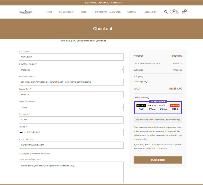 6) After you click CHECKOUT you will see these form. If you are a new customer, you need to fill in this form for billing & delivery purpose. After you have completed the form you can click PLACE ORDER and the website will direct you to the payment gateway for you to complete the payment for the order.